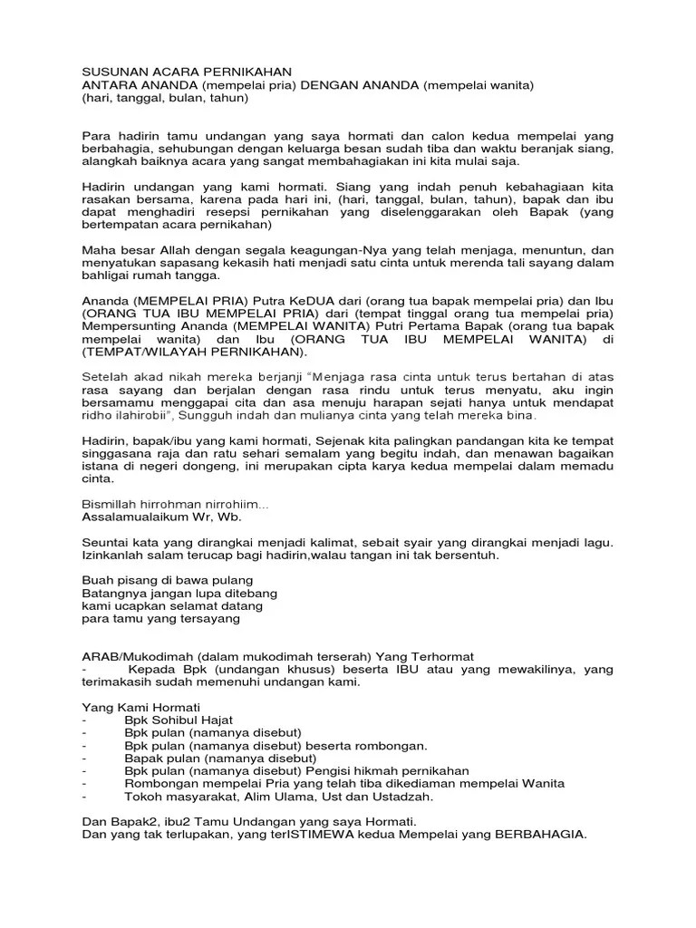 susunan acara akad nikah ini biasanya hampir sama, baik akan dilakukan di rumah, masjid ataupun gedung. Berikut ini adalah tentang menyelenggarakan resepsi pernikahan yang umum digunakan di sebuah gedung:1. Contoh naskah dan susunan acara pernikahan. Agar lebih jelas, sebaiknya simak penjelasan mengenai susunan acara pernikahan modern berikut ini: Belajar mc nikah pembukaan contoh naskah mc nikah bahasa indonesia.